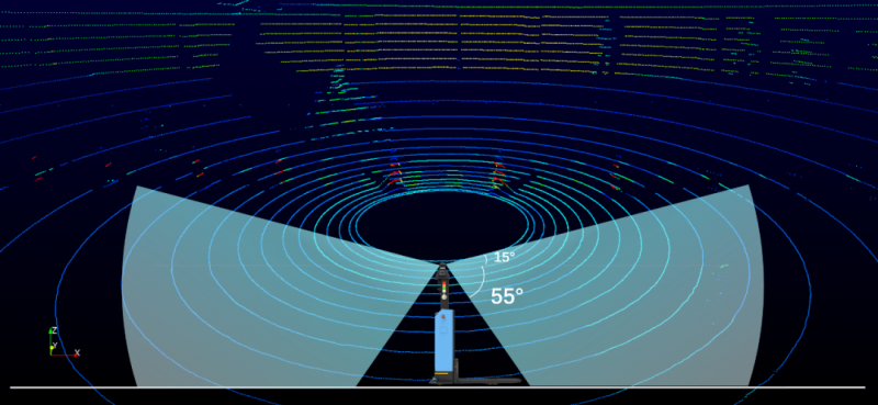 注:部署于仙工智能自動(dòng)叉車(chē)的 RS-Helios 垂直視場(chǎng)角示意圖與室外實(shí)時(shí)三維成像點(diǎn)云