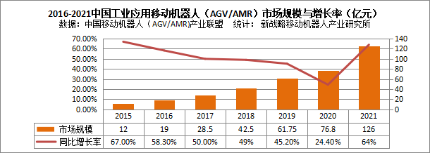 圖表:2015-2021中國(guó)工業(yè)應(yīng)用移動(dòng)機(jī)器人(AGV/AMR)市場(chǎng)規(guī)模(億元)與增長(zhǎng)率